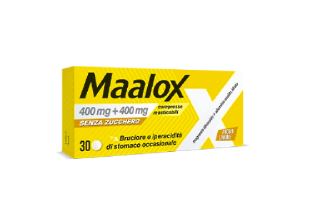 MAALOX 400 mg + 400 mg compresse masticabili senza zucchero aroma frutti rossi è disponibile in una scatola contenente 30 compresse masticabili.